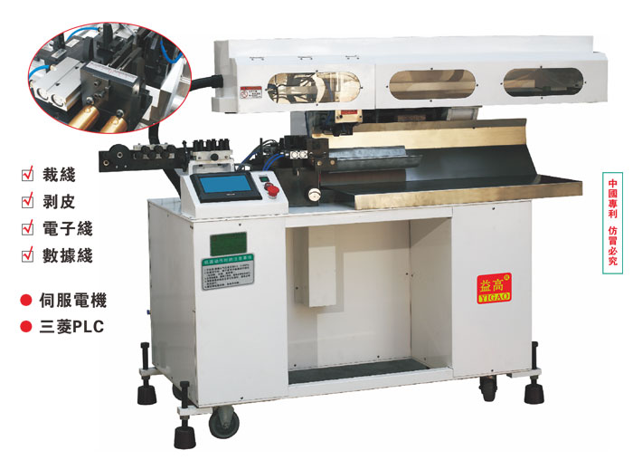 本機(jī)使用日本三菱 PLC 及人機(jī)介面觸摸屏,采用日本安川YASK伺服馬達(dá),日本 SMC 氣缸,德國(guó)FESTO電磁閥,日本歐姆龍OMRON感應(yīng)器,日本THK 直線導(dǎo)軌。 綜合了電腦式裁線機(jī)易調(diào)省時(shí)和機(jī)械裁線機(jī)產(chǎn)量大效率高的優(yōu)點(diǎn) 。延前夾和延后放的功能大大增加了本機(jī)的可適用性 ,可操作性,速度快、穩(wěn)定性好、精確度高。 可加工電線種類如單股線、隔離線、排線、并線、各式單心線、電腦線 等。 此款非標(biāo)機(jī)型可定制最長(zhǎng)單次行程達(dá)十五米YG-15000L,也可增加其功能:需要帶分線則為"+F"機(jī)型;需要多段裁剝則為"+B"機(jī)型、特殊線材可另加裝塞線部分等,且有中英文版供客人選用。